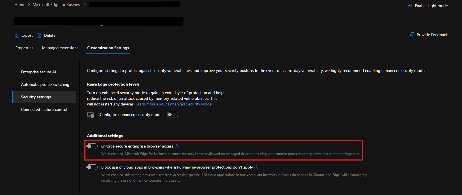 - Select an existing policy, and click on customization settings. From here navigate to the security settings, and the policy that does the magic is "Enforce secure enterprise browser access".