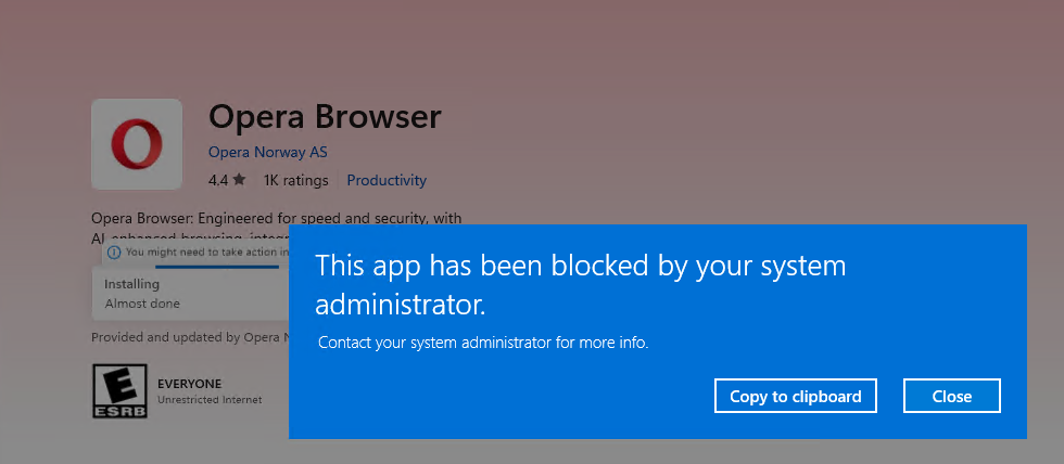 Now that it's applied to the devices, the user will see that it's not possible to use and install Opera as an example. In the below example, we've tried to install it from the Microsoft Store.