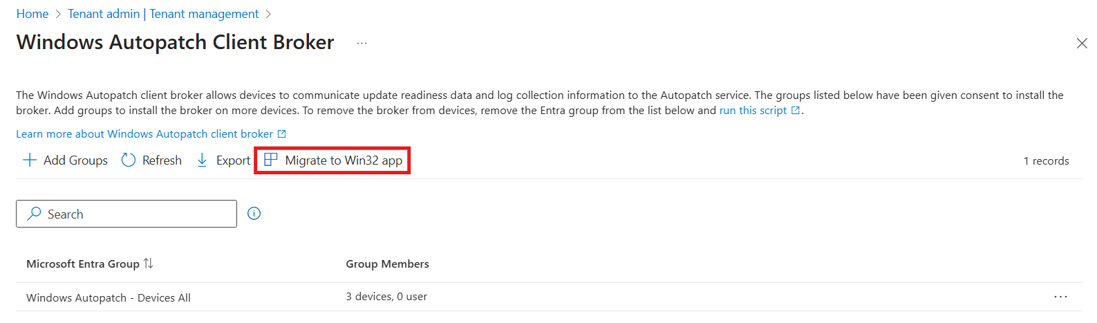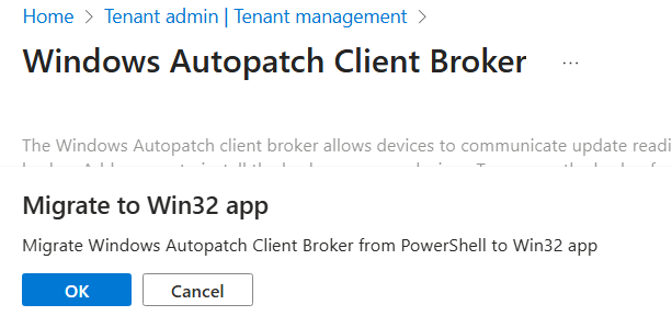 If you take a look under tenant administration and tenant management in the Autopatch section, you can see the recommendation for migrating to Win32.