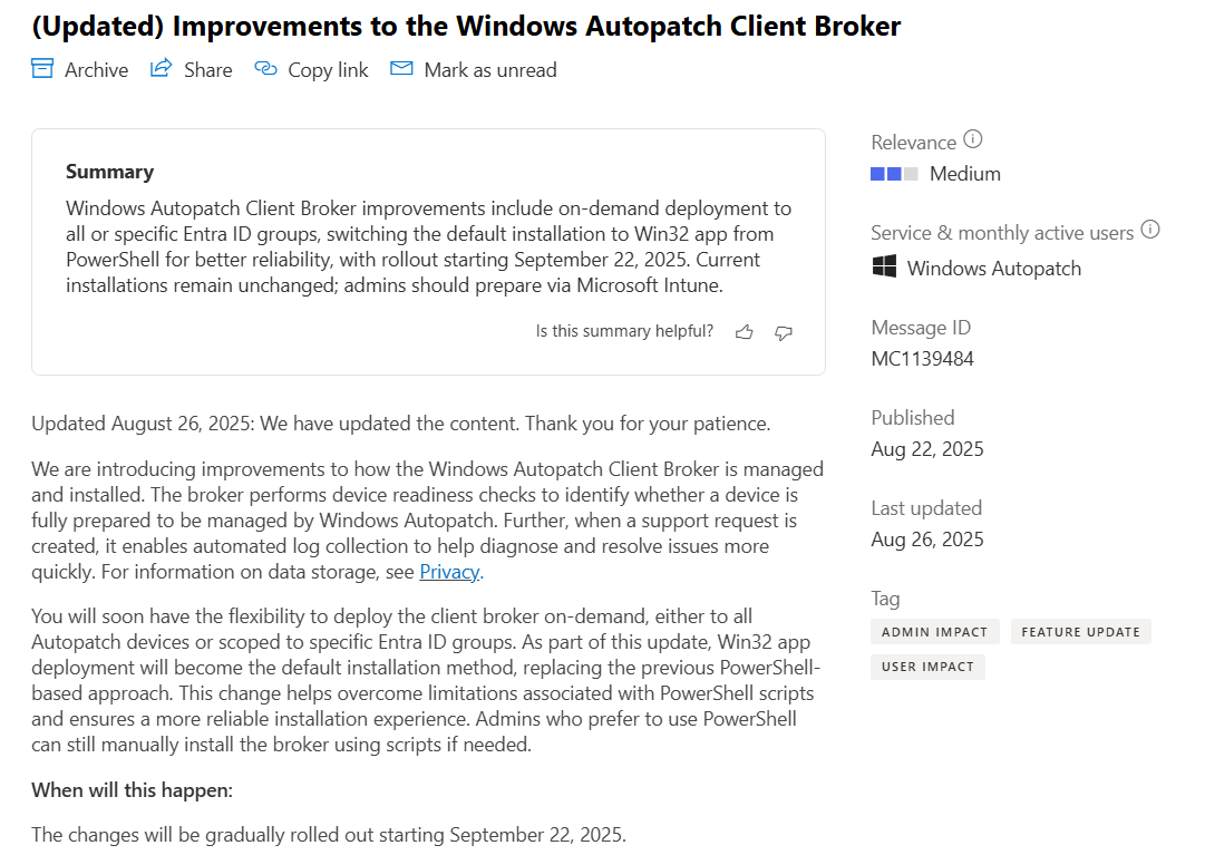 If you have configured Autopatch a while back, you might know that the client broker, is getting deployed by a platform script in Microsoft Intune. This is about to change!